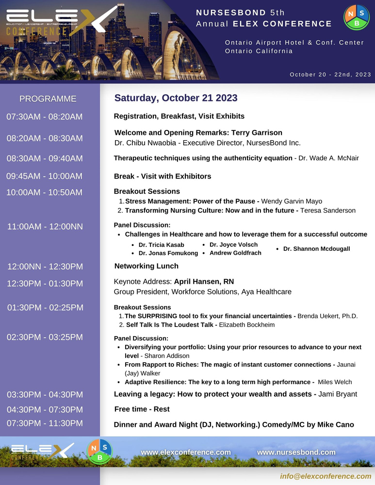 The ELEX Conference is the signature NursesBond event for healthcare professionals and entrepreneurs who care about their communities, careers, and workforce well-being. This annual event brings together professionals, thought leaders, and business owners from all areas of the healthcare industry to advance their professional relationships and maximize their impact in their various pursuits.